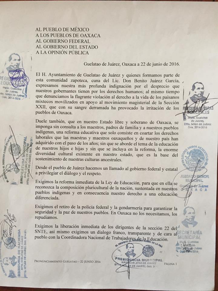 Guelatao-statement Published July 6, 2016 at 720 × 960 in Oaxaca 2016: “This is not a teachers struggle, it belongs to the people of Mexico” ← Previous Next → Statement from the people of Guelatao de Juárez, signed on by the municipal authorities of the Sierra Juárez.