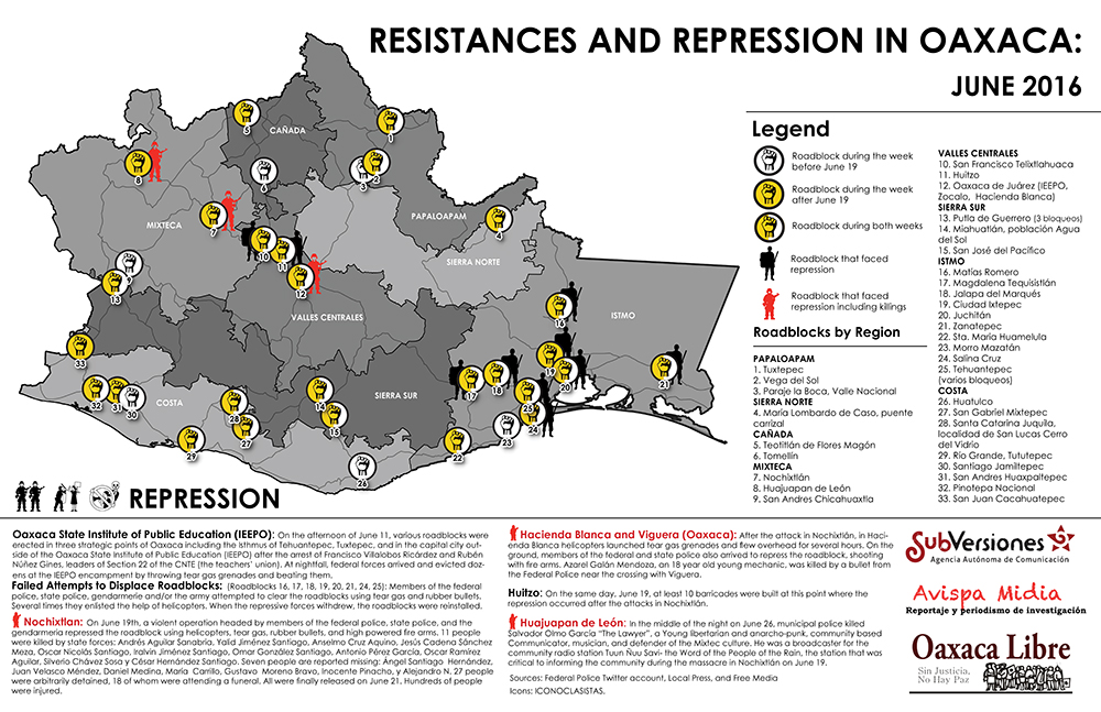 map-blockades-barricades-repression-oaxaca-2016 Published July 6, 2016 at 1000 × 647 in Oaxaca 2016: “This is not a teachers struggle, it belongs to the people of Mexico” ← Previous Next →