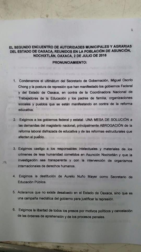 second-gathering-authorities-nochixtlan Published July 6, 2016 at 540 × 960 in Oaxaca 2016: “This is not a teachers struggle, it belongs to the people of Mexico” ← Previous Statement from the second gathering of municipal and agrarian authorities of Oaxaca.